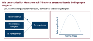 Mittels zweier Datensätzen wird gezeigt, dass und wie verschiedene Persönlichkeitsmerkmale – insb. IT Mindfulness, aber auch Personal Innovativeness in IT und Neurotizismus – das Stressempfinden bei der Nutzung von IT beeinflussen. Hiermit wird herausgestellt, dass technologiebedingter Stress nicht nur von technologischen Merkmalen hervorgerufen wird, sondern darüber hinaus in der Person selbst begründet liegt. Zusätzlich zeigt die Arbeit, dass es einen umgekehrt u-förmigen Verlauf zwischen Technostress und Nutzerperformanz gibt, so dass sich ein gewisses Maß an Technostress positiv auf die Leistung auswirkt.