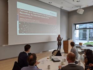 Im Vortrag von Jessica Ochmann wurde das Thema Fairness hinsichtlich der Akzeptanz von KI in Rekrutierungsprozessen diskutiert. Die qualitative Studie, die Teil des durch die Adecco-Stiftung geförderten Projektes zur Untersuchung der Akzeptanz von KI durch Kandidaten ist, untersuchte die Bedeutung und Dimensionen von Fairness für die Akzeptanzentscheidung sowohl von Kandidaten aber auch von Unternehmen. In der Studie wurde Fairness als ein Multi-Level-Phänomen eingeführt und dessen Dimensionen diskutiert.