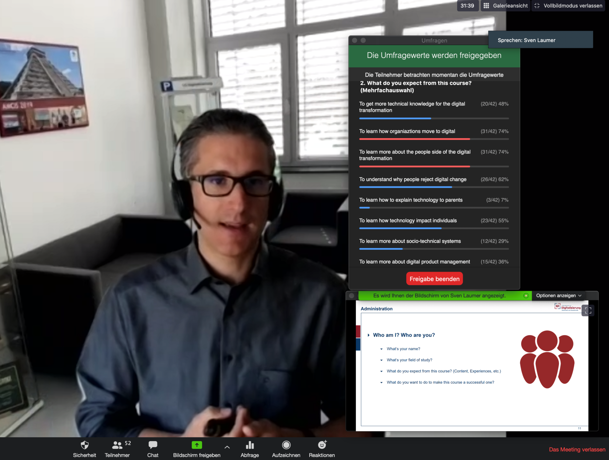 Nach wie vor setzen wir als Lehrstuhl auf eine gesunde Kombination von synchronen und asynchronen Formaten, so dass Wissensvermittlung, Wissensanwendung und Wissensumsetzung auch digital zu guten Lernerfolgen führen kann. Dazu haben wir vorab asynchrone Lernformen angefertigt und bestehende Lehrangebote weiterentwickelt, die wir den Studierenden nun anbieten können.
